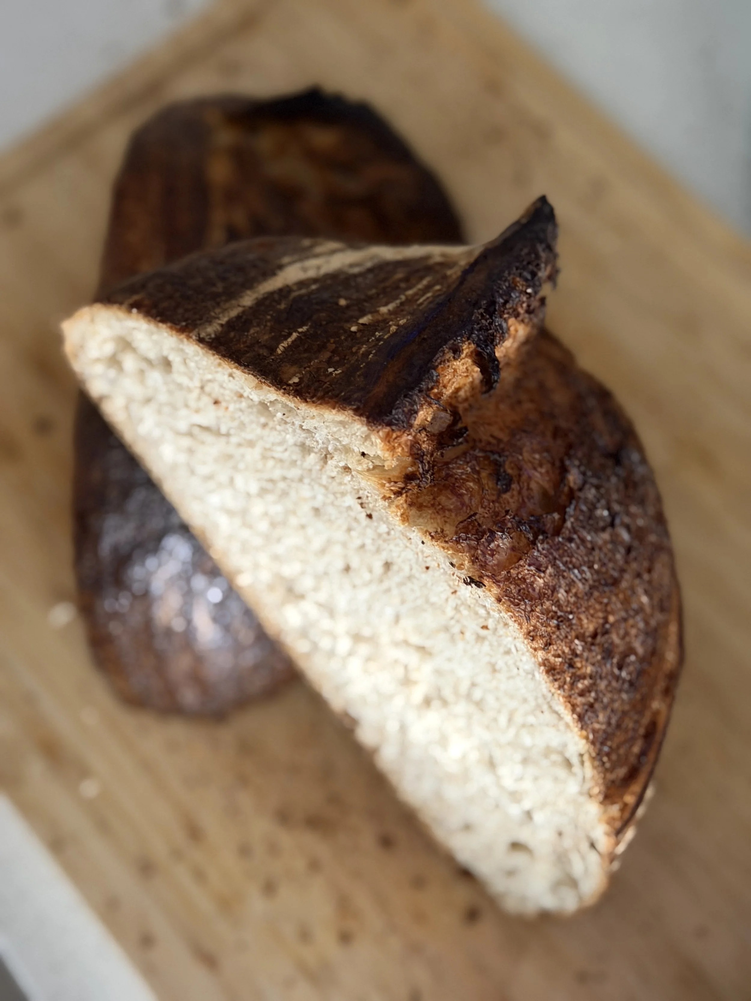Naturally leavened sourdough made with Colorado-grown wheat and rye, baked to a deeply caramelized crust with an airy, chewy crumb and developed through slow fermentation for rich, nuanced flavor.