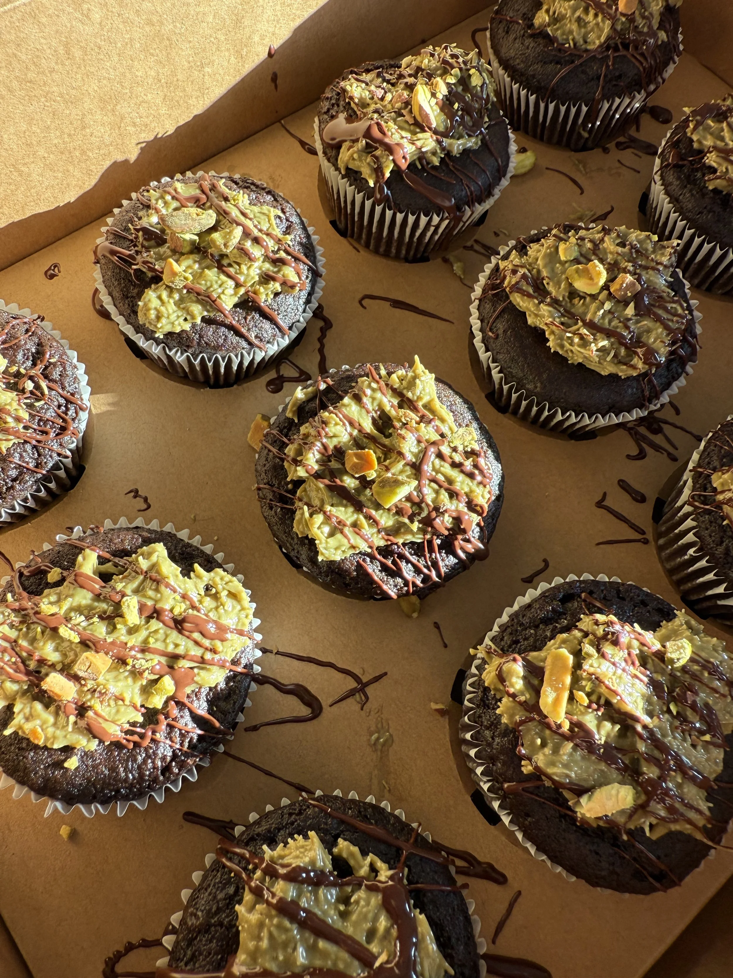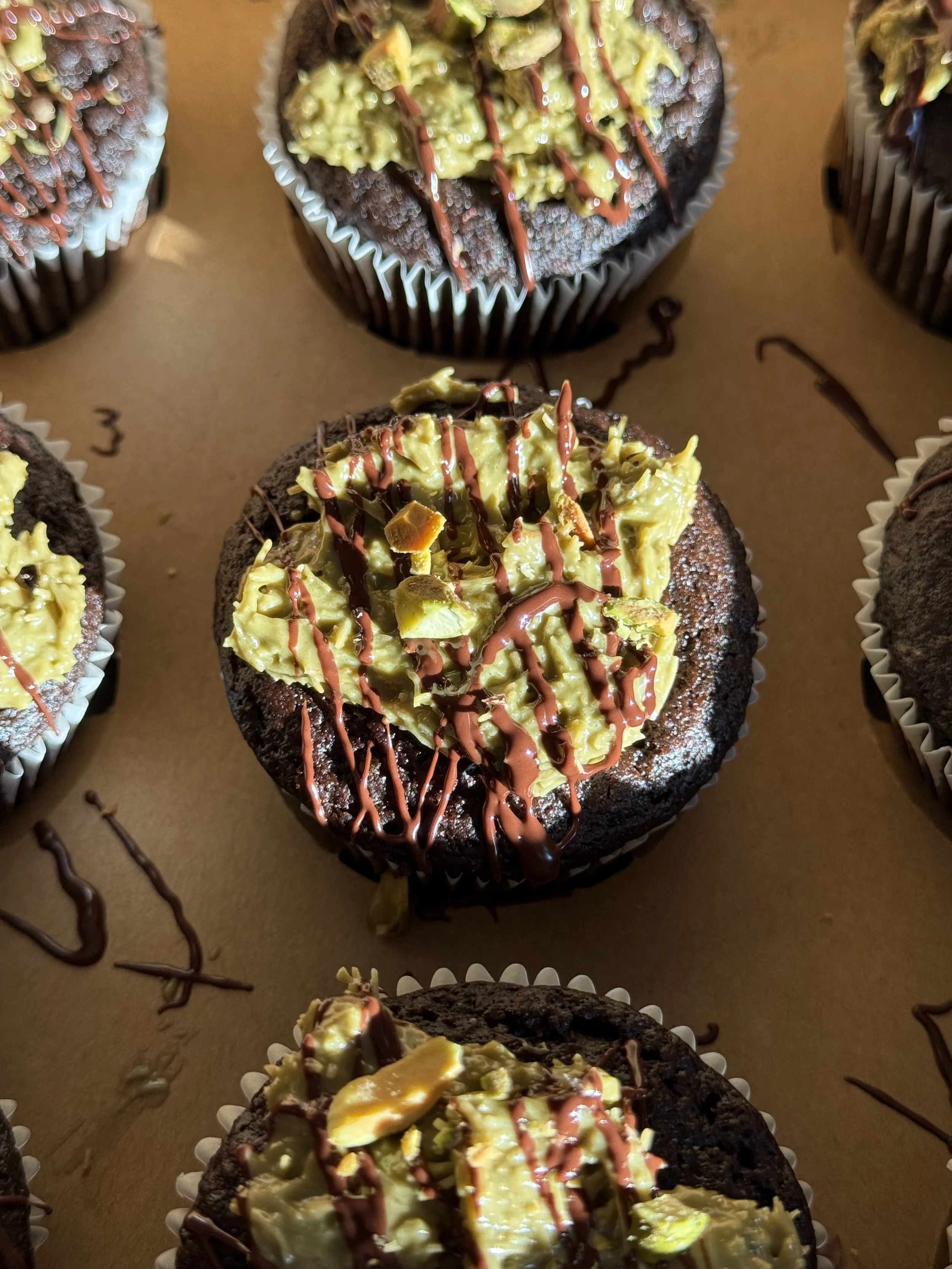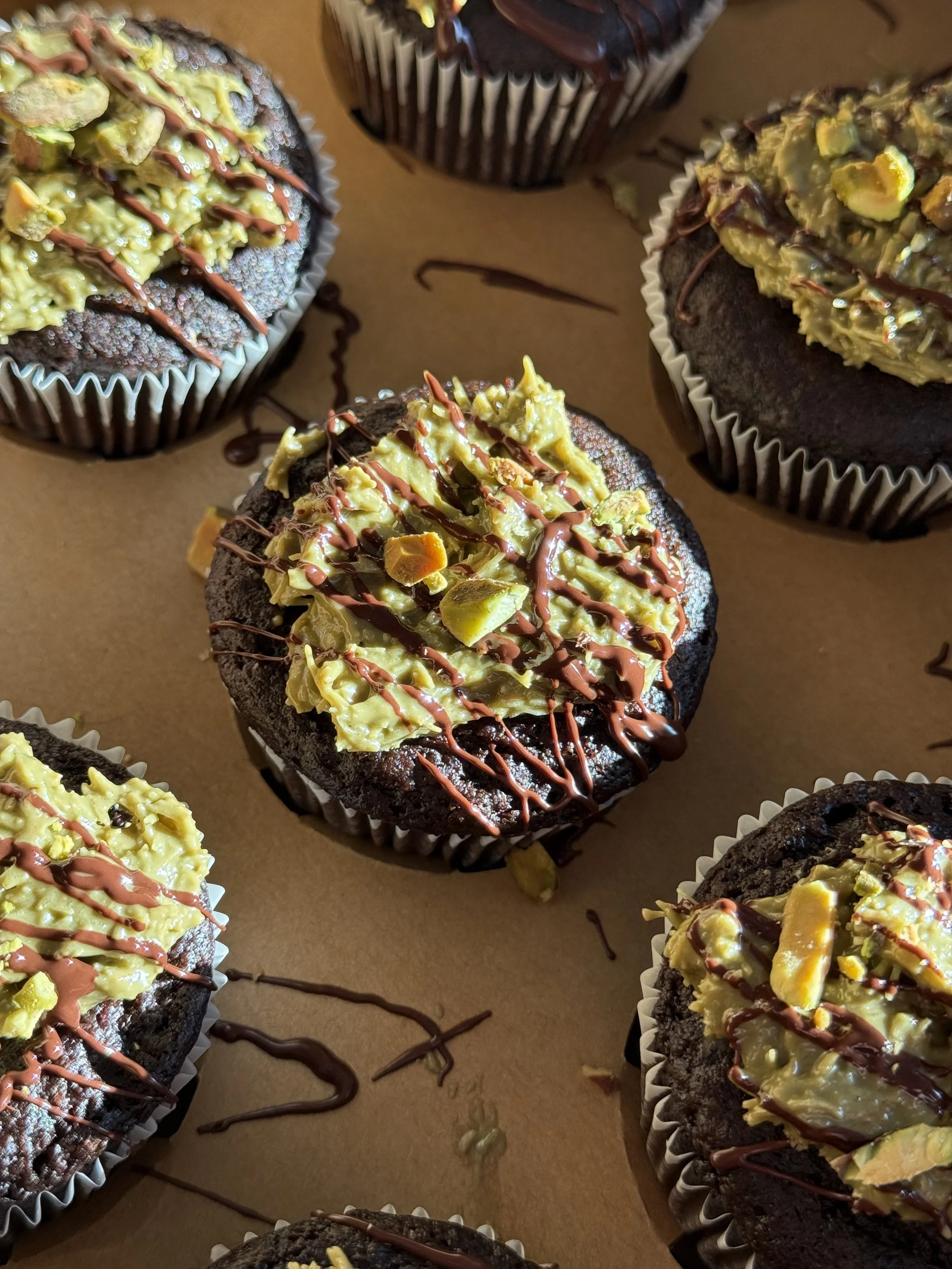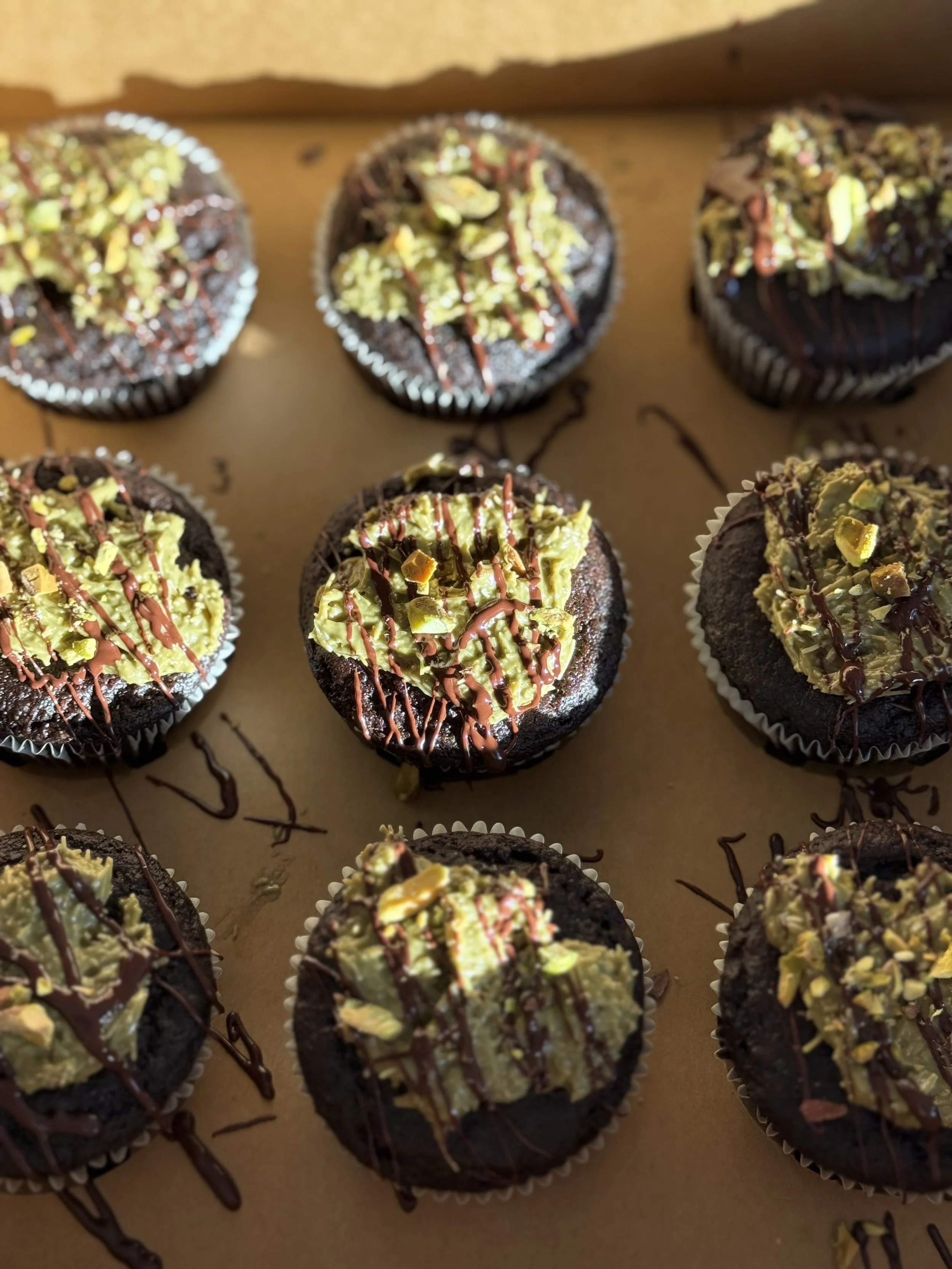 A cupcake that’s unapologetically chocolate. These cupcakes carry the deep flavor of fine chocolate without being overly sweet. Each one is crowned with a generous helping of pistachio cream-coated kataifi, chocolate drizzle, and crushed pistachios. The result is decadent but refined — the kind of chocolate dessert you savor slowly, not devour in haste.