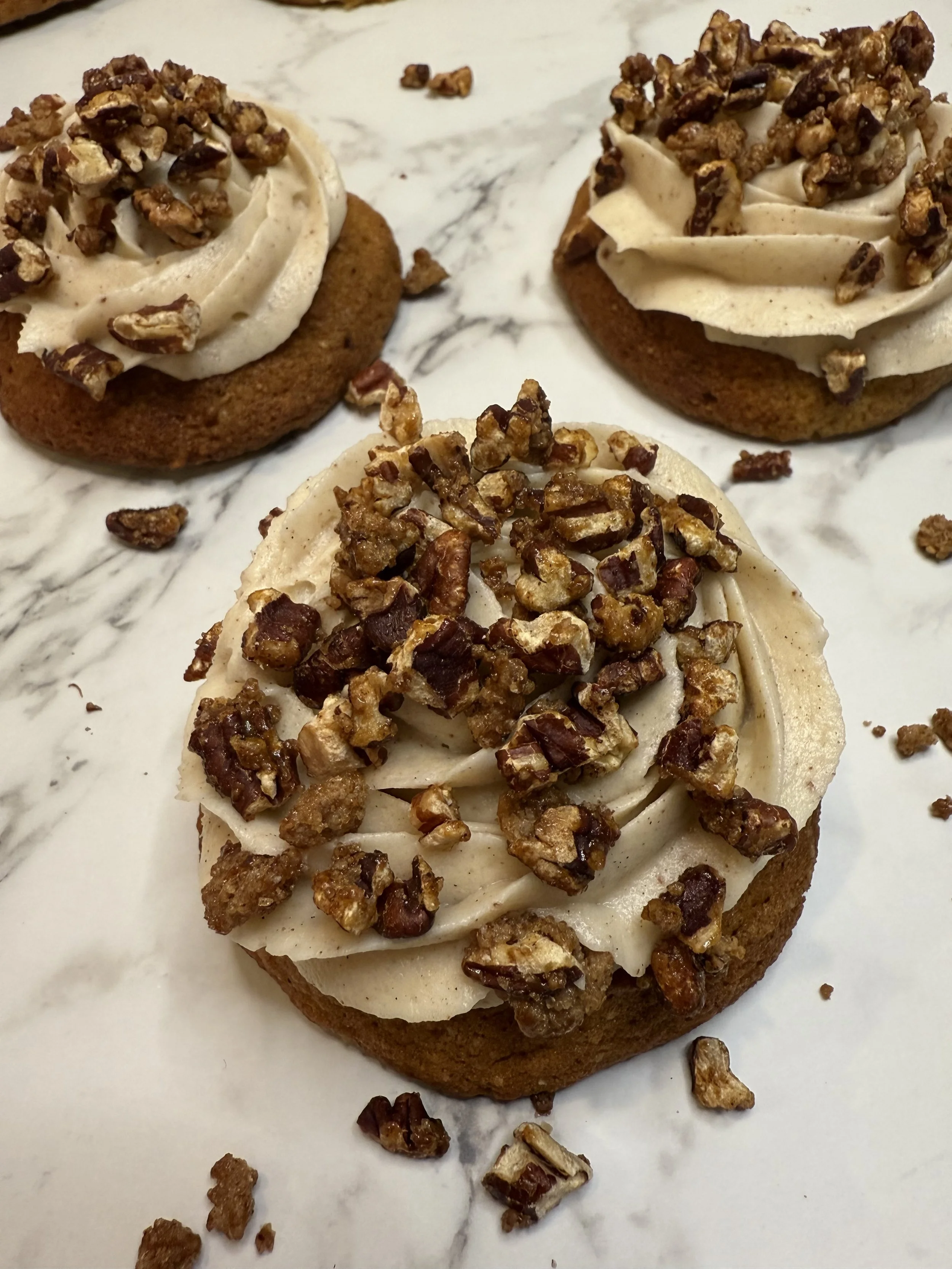 Soft, cake-like pumpkin cookies infused with warm autumn spices and topped with a generous swirl of cream cheese frosting. A sprinkle of handmade praline pecans adds a satisfying crunch and caramel sweetness. These cookies capture the spirit of fall in every bite — cozy, aromatic, and beautifully balanced.