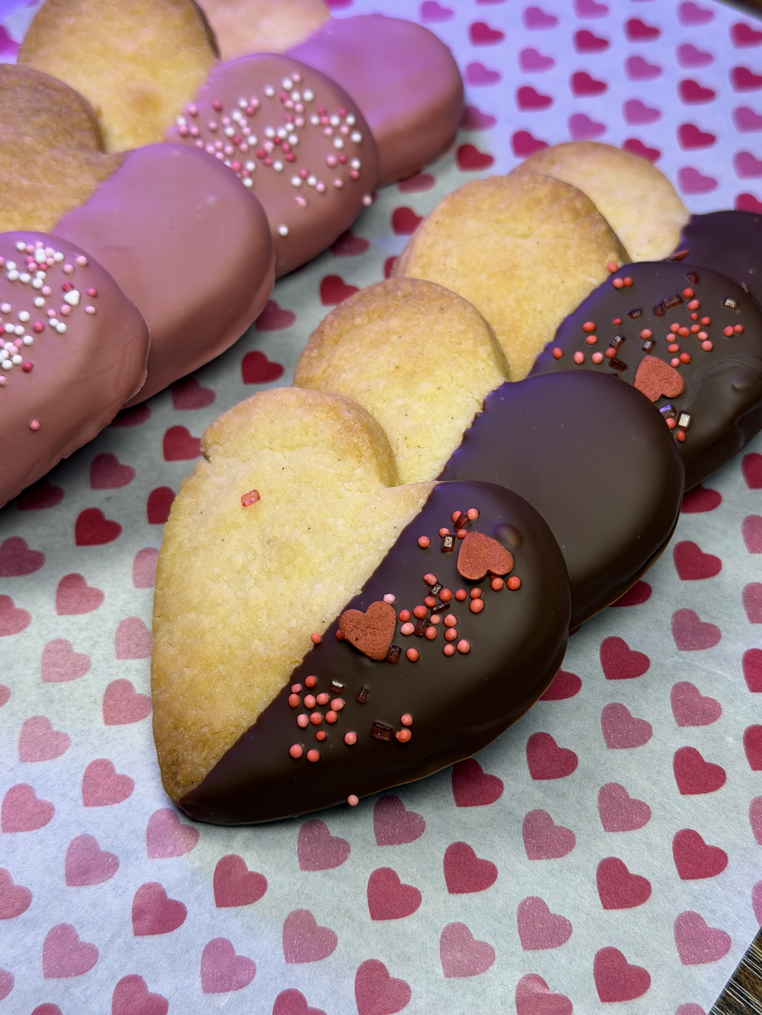 Classic buttery shortbread cookies, baked until delicately crisp and tender, dipped in dark and ruby chocolate. Simple, elegant, and perfect with coffee, tea, or as part of a Valentine gift box.